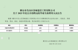 雅安市名山區茶城建設工程有限公司系雅安市名山區區屬一級國有企業,成立于2018年10月,注冊資本金25000萬元,主要經營范圍為對土地、城市資源等領域及保障性住房、房地產開發、城市基礎設施、公共服務設施等進行經營管理;并開展項目投資、工程管理服務、園林綠化、環境治理工程、土地整理和各類工程建設活動等。根據公司2023年人員招聘計劃,茶城公司擬面向社會公開招聘3名工作人員。現將有關事項公告如下:一、報名條件(一)招錄崗位、名額及招錄資格條件(見附表)(二)基本條件1.本科及以上學歷、學士及以上學位。包括2023年應屆高校畢業生;2022年、2021年未參加工...