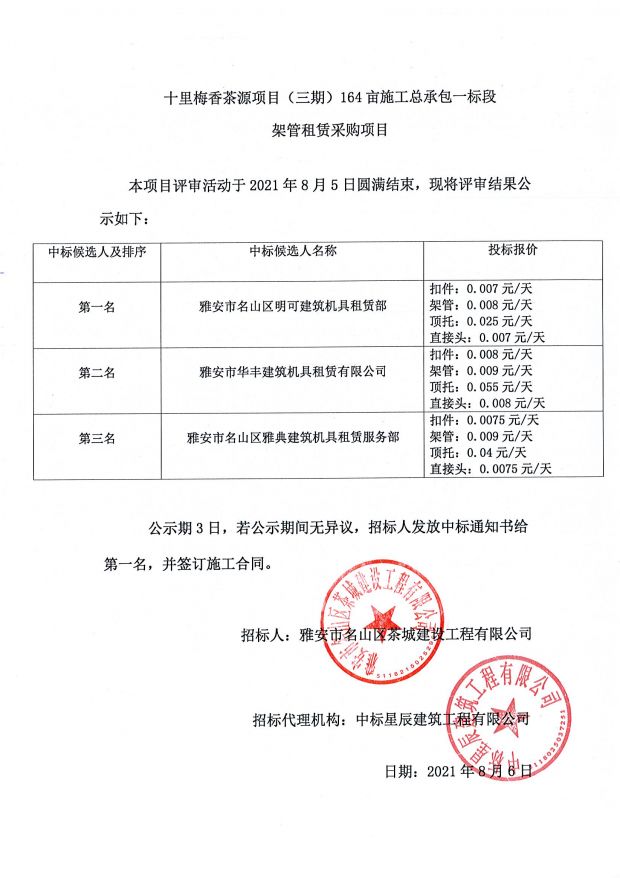 十里梅香茶源項目(三期)164畝施工總承包一標(biāo)段架管租賃采購中標(biāo)公示